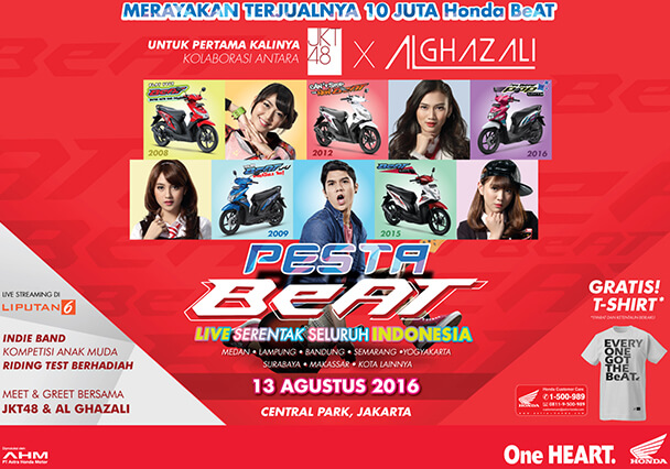 Merayakan terjualnya 10 Juta unit Honda BeAT, PT Astra Honda Motor (AHM) bakal menggelar pesta BeAT secara live serentak di beberapa kota di Indonesia pada 13 Agustus 2016. Medan, Lampung, Bandung, Semarang, Yogyakarta, Surabaya, Makassar dan beberapa kota lainnya akan ikut menggelar event Pesta BeAT ini.