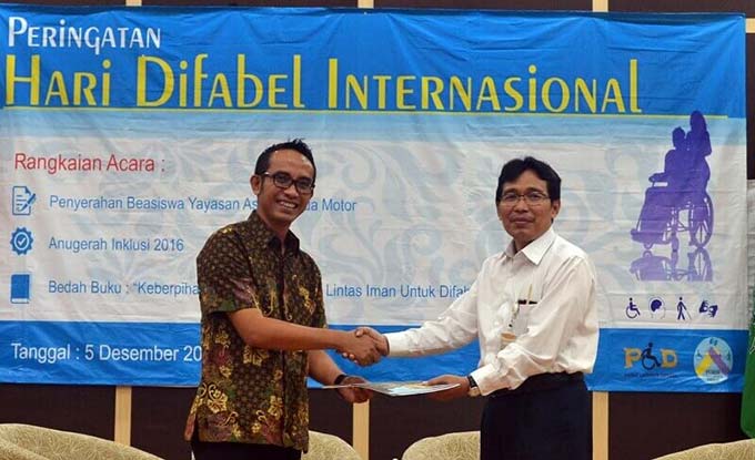 Anugerah Inklusi 2016 ini diberikan langsung oleh Wakil Rektor Bidang Kemahasiswaan dan Kerjasama UIN Sunan Kalijaga Yogyakarta Dr. Waryono kepada Deputy Head of Corporate Communcation AHM Ahmad Muhibbuddin dalam acara peringatan Hari Difabel Internasional 2016 yang diselenggarakan di Convention Hall UIN Sunan Kalijaga Yogyakarta pada Senin(05/12). Dalam acara ini juga dilaksanakan penyerahan beasiswa secara simbolik dari Yayasan Astra Honda Motor untuk para mahasiswa difabel yang sedang menempuh kuliah di kampus ini.