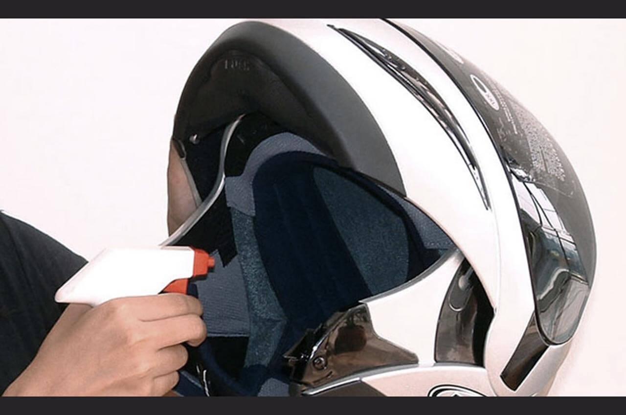 Sebelum dibersihkan dengan pakai air, bisa dengan menggunakan alkohol kadar ringan untuk membunuh kuman atau bakteri di kain atau busa helm.