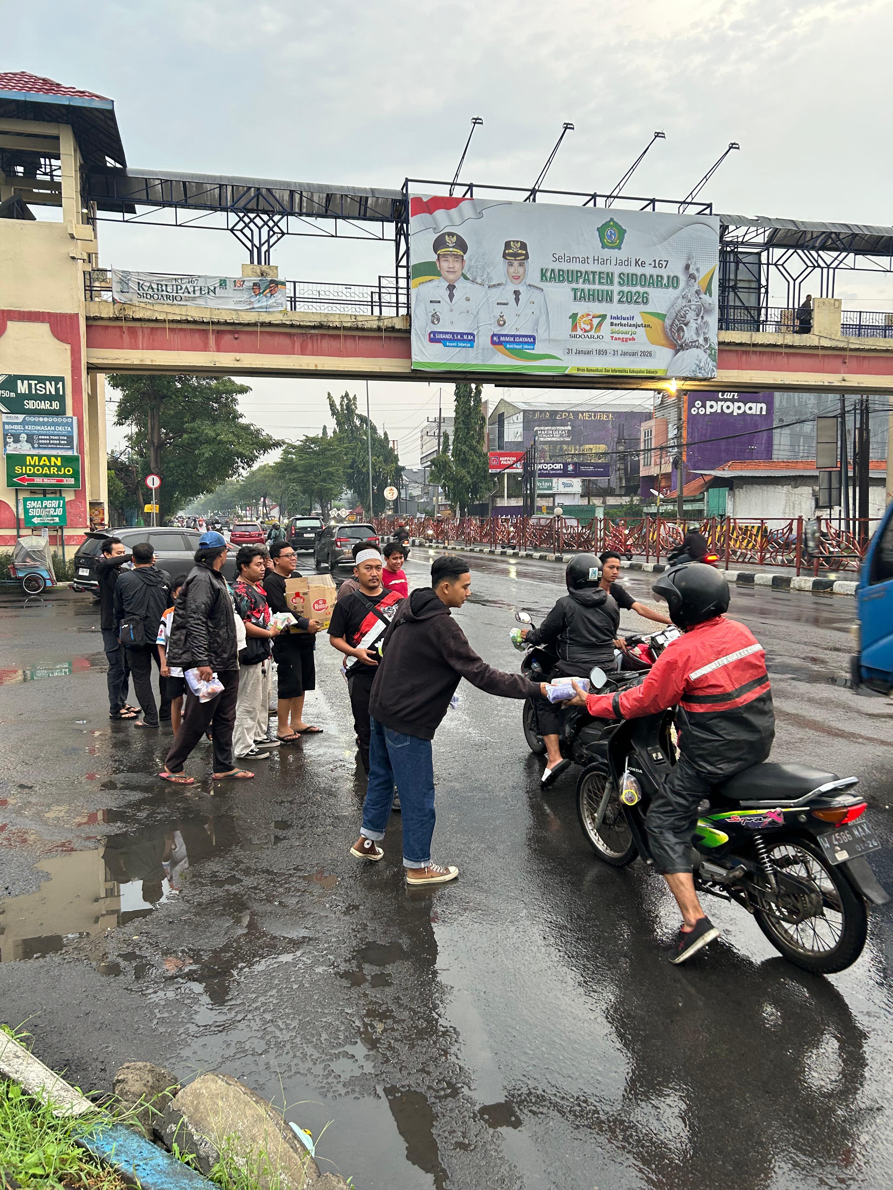 Tepat pukul 17.00 takjil dibagikan kepada masyarakat sekitar dan pengendara kendaraan yang lewat dengan pembagian yang teratur sehingga tidak mengganggu lalu lintas.
